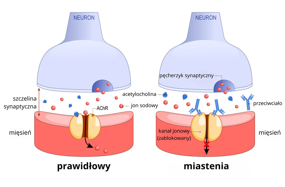 Miastenia gravis to choroba, w której układ odpornościowy atakuje własne połączenia nerwowo-mięśniowe, przez co mięśnie stają się słabsze i szybciej się męczą. W zdrowym organizmie nerwy wysyłają do mięśni sygnały za pomocą neuroprzekaźnika acetylocholiny. U osób z miastenią układ immunologiczny błędnie produkuje przeciwciała, które atakują receptory acetylocholiny (AChR) lub inne białka połączeń nerwowo-mięśniowych. To sprawia, że sygnał nerwowy nie dociera do mięśni prawidłowo, co prowadzi do ich osłabienia.