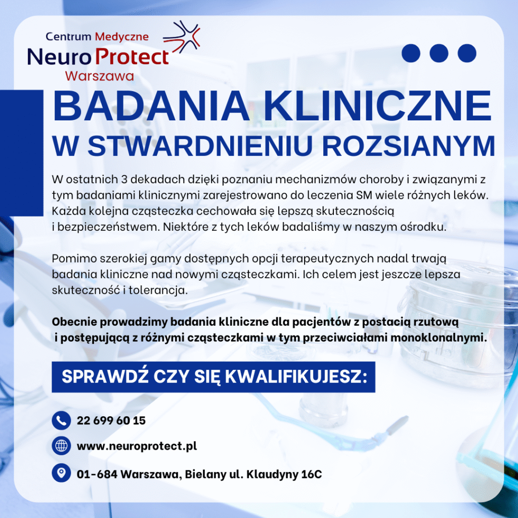 Prowadzimy badania kliniczne z nowymi terapiami dla chorych ze stwardnieniem rozsianym.