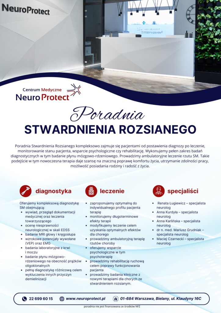 Poradnia Stwardnienia Rozsianego kompleksowo zajmuje się pacjentami od postawienia diagnozy po leczenie, w tym ambulatoryjne leczenie rzutu SM. Wykonujemy ambulatoryjnie badanie płynu mózgowo-rdzeniowego na obecność prążków oligoklonalnych. Monitorujemy efekty leczenia, w przypadku konieczności modyfikujemy je aby uzyskać optymalne efekty. Oferujemy wsparcie psychologiczne oraz rehabilitację. Takie podejście w tym nowoczesna terapia, również w badaniach klinicznych, daje szansę na znaczną poprawę komfortu życia, utrzymanie zdolności pracy, możliwość posiadania rodziny i radość z życia.
